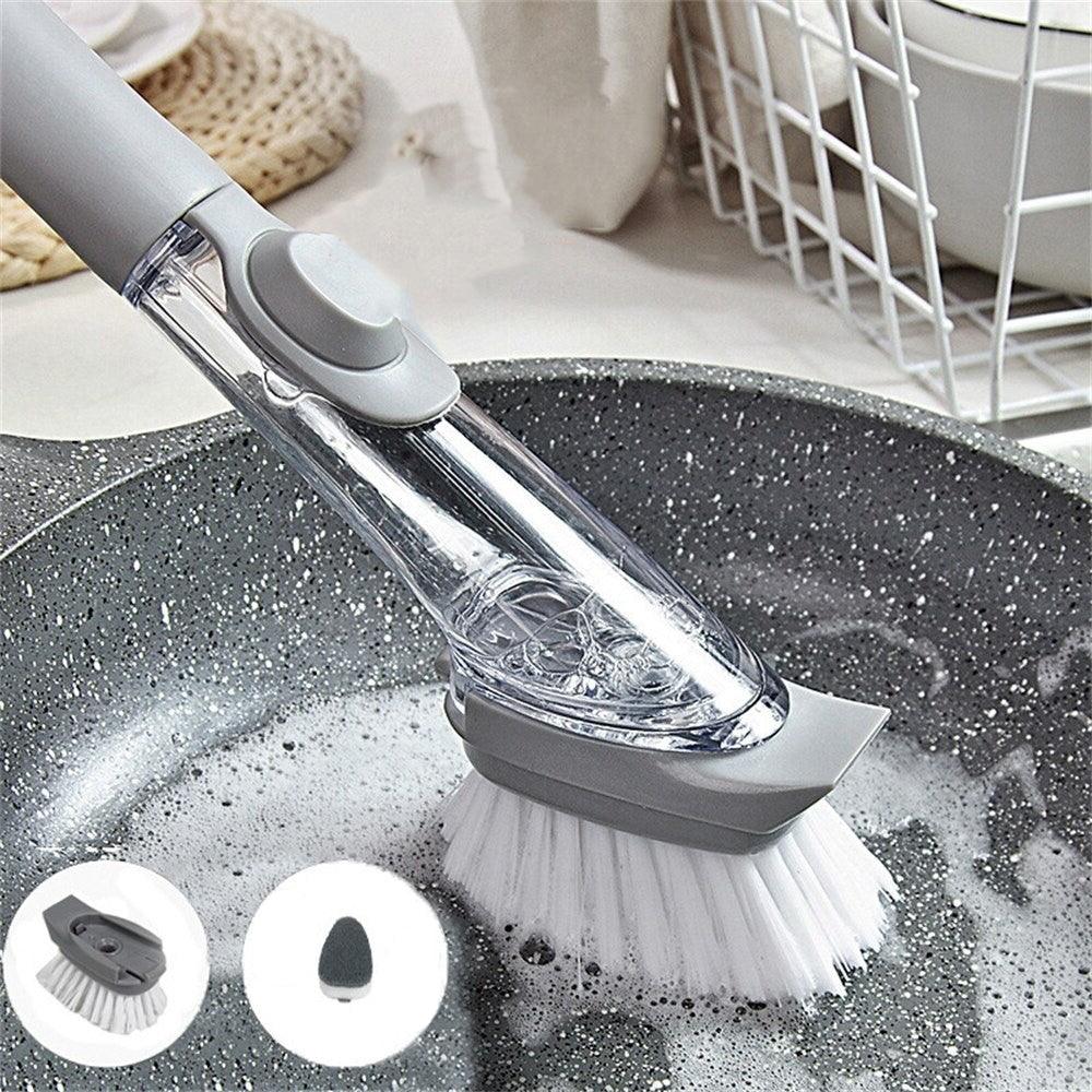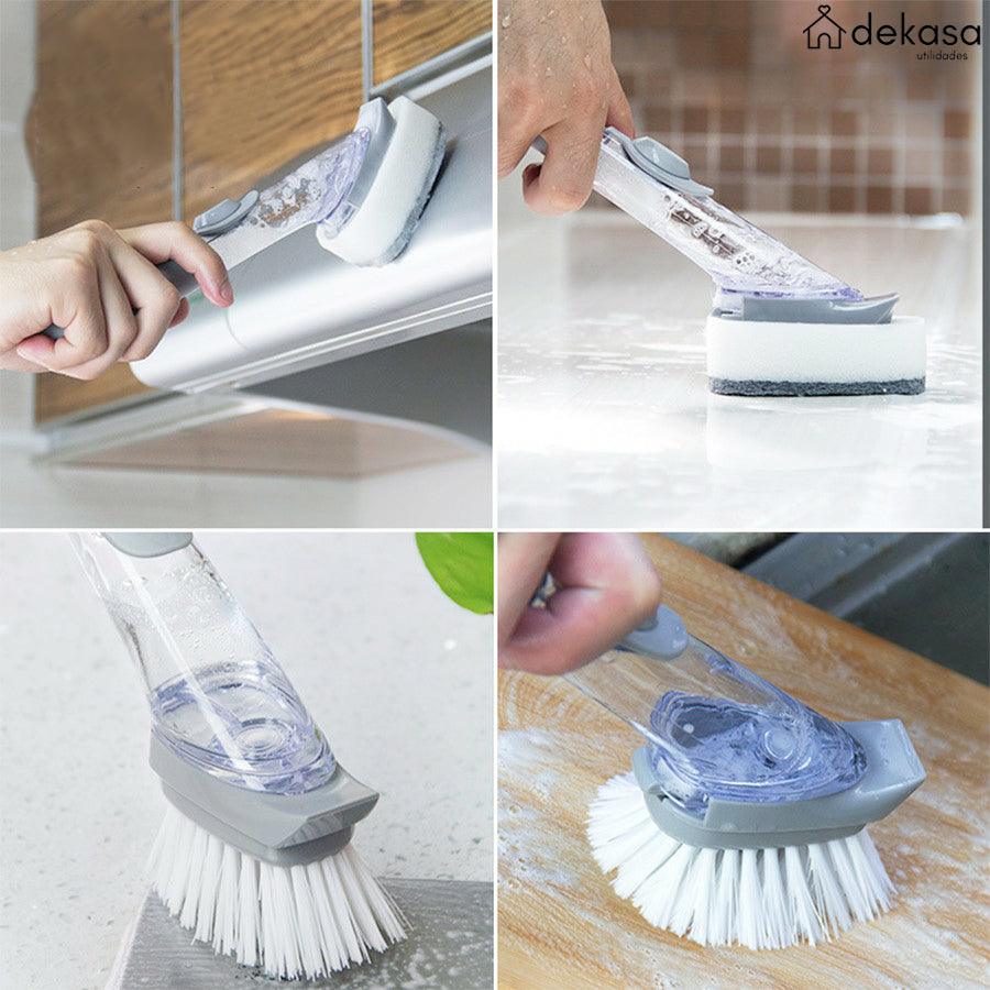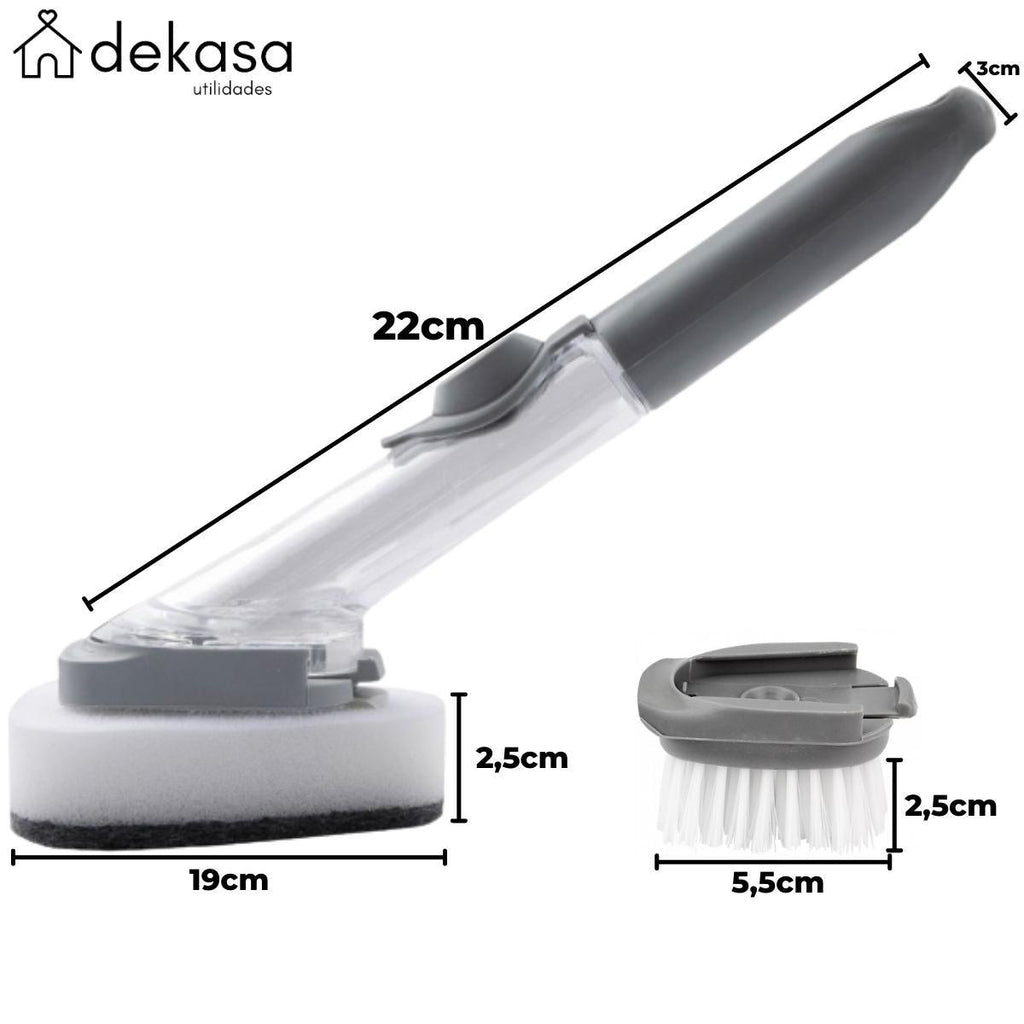 Chega de sofrer ao lavar uma louça, tocando na sujeira ou desperdiçando muito detergente! Agora com a escova de limpeza 2 em 1 você limpa sujeiras difíceis de panelas, pratos e talheres com facilidade e sem tocar no sabão.