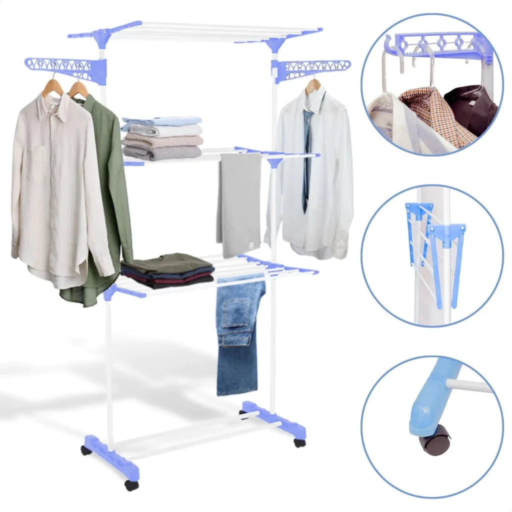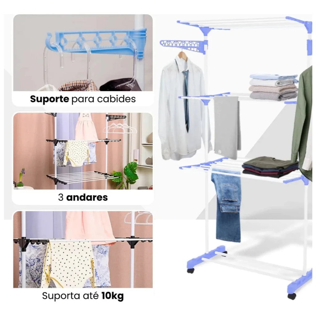 Chega de roupas espalhadas e varais frágeis! O Varal de Chão 3 Andares Dobrável, Retrátil e Portátil é resistente, elegante e prático, perfeito para qualquer ambiente. Com rodinhas de fácil movimentação, você vai secar suas roupas com conforto, segurança e organização.
